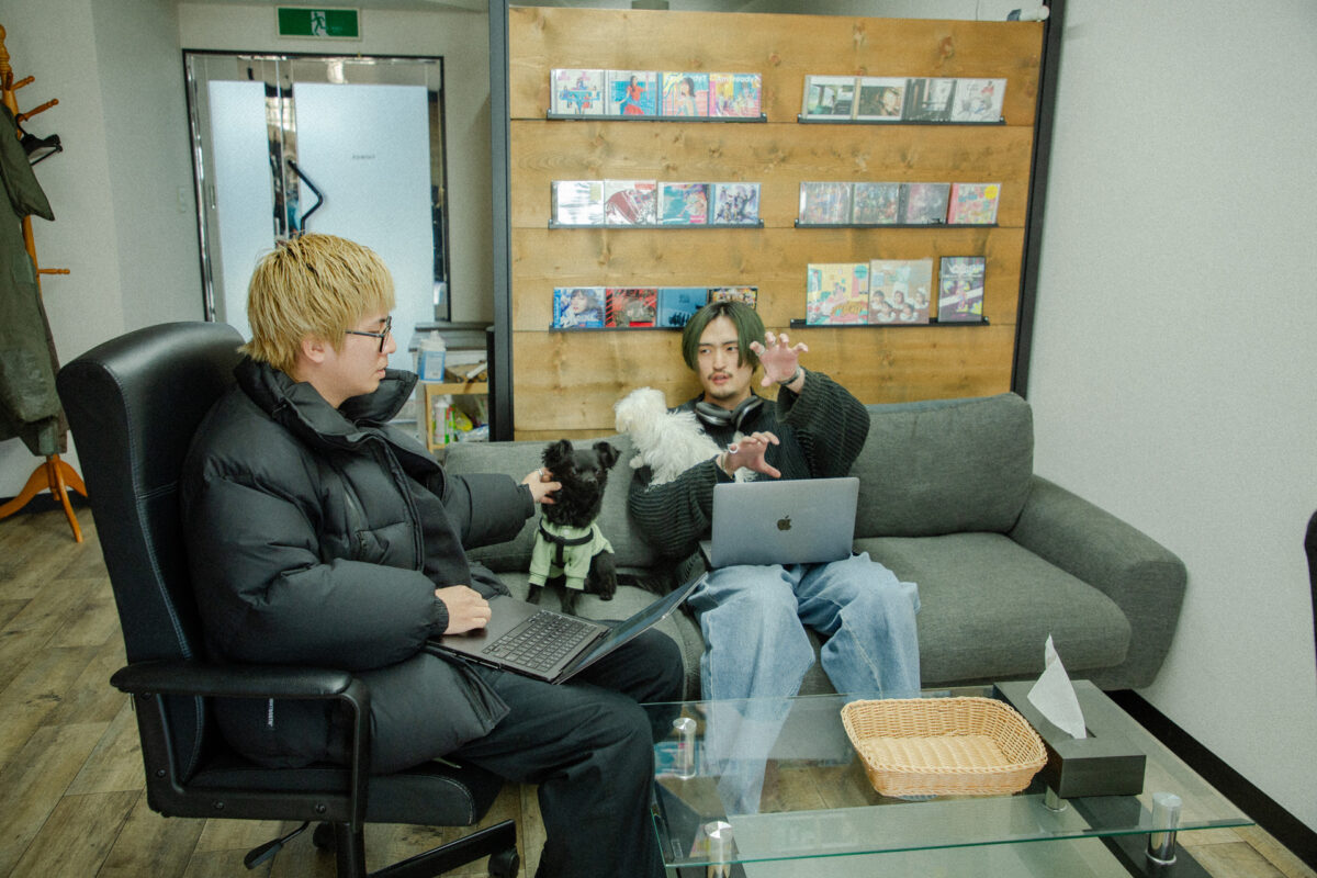 オフィスでのAKITO。最近は愛犬たちに見守られながら作業している
